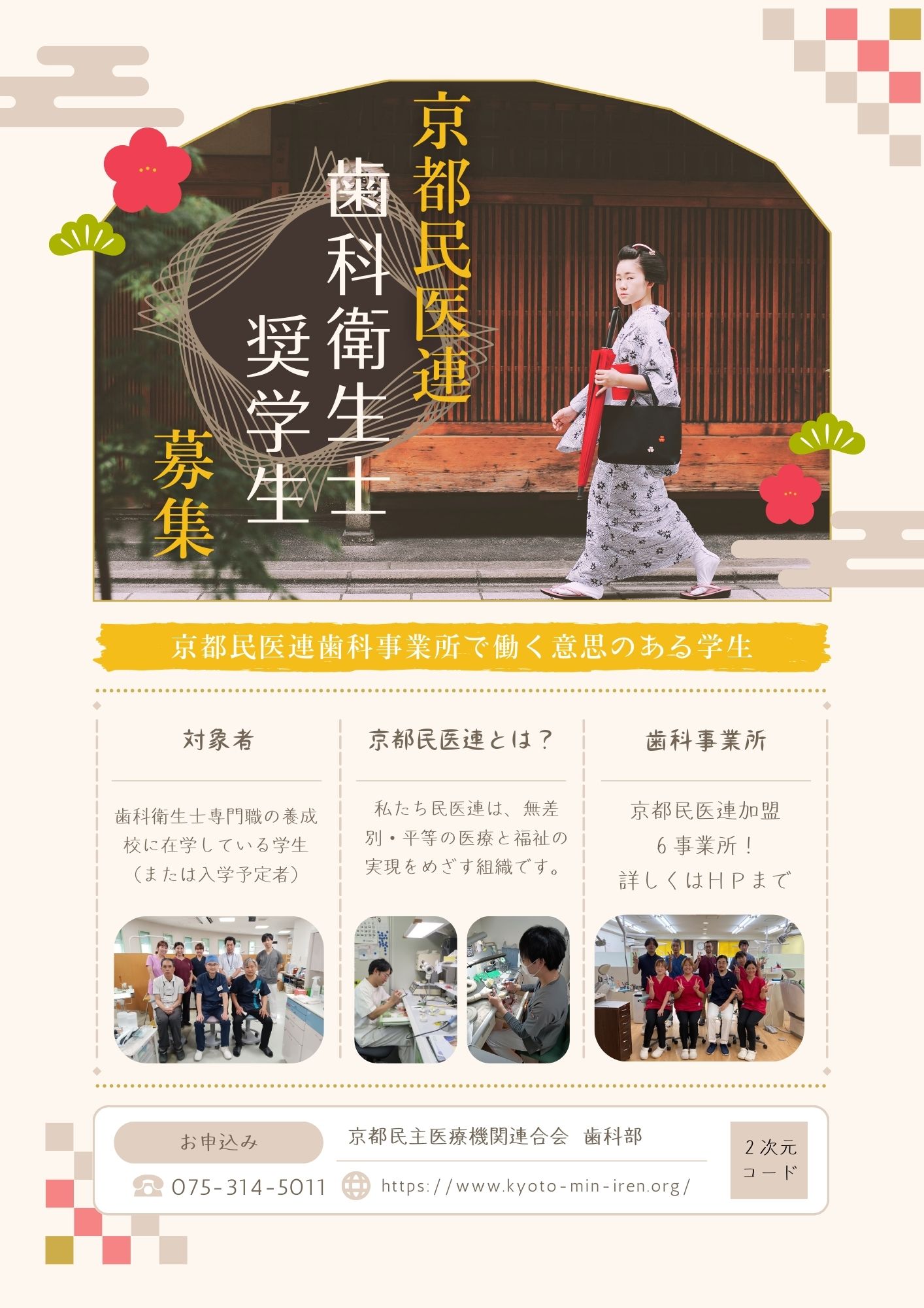 歯科衛生士専門職の養成校に在学している学生(または入学予定者)で、将来京都民医連歯科事業所で働く意思のある学生 ※京都市在住または京都府出身の学生優遇